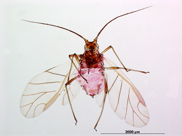 is a cosmopolitan aphid prefering rosaceous plant species and mints.
