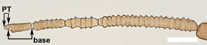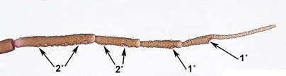Aphid antennas are composed of three muscularized articulated true segments. The scape is the first, the pedicel second, and the remainder of the antenna is the flagellum. Most features used for aphid identification are those of the four (rarely three) flagellomeres. In common parlance, each of the antennomeres is referred to as a segment.