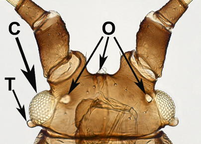 The left compound eye is labeled C, the left triommatidium on an ocular tubercle is labled T, and all three ocelli are labeled O.