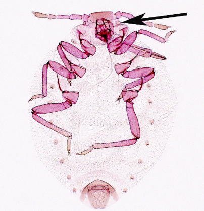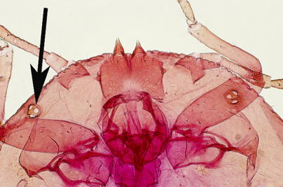 Only the triommatidia remain (arrow). The ocelli are also absent.