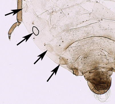 These wax glands encircle the entire body of the aphid Cerataphis brasiliensis. They are located all around the margins of this flattened species.