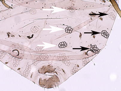 Although usually clustered in groups, sometimes wax glands are found singly or arrayed in a line.